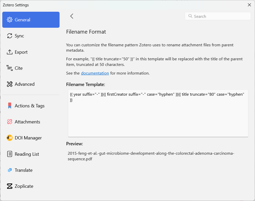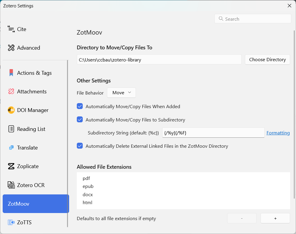 Directory to Move/Copy Files To should be your library directoryFile Behavior leave as Move{/%y}{/%F}~/Year/First_Author~/2014/ZutJ)/{%y}_{%a}~/Year_AuthorLastName~/2014_Zut)General 🢖 File HandlingFollow the instructions for any popular tool